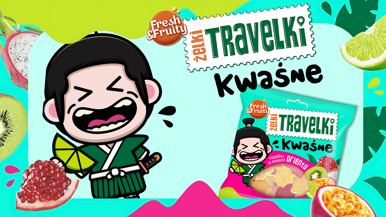 Kwaśne żelki Travelki to nowość od Fresh&Fruity, wytwarzane w oparciu o innowacyjną recepturę, wyłącznie z dobrych składników. Pozbawione zbędnych i niepotrzebnych dodatków – barwników, sztucznych aromatów i substancji konserwujących – żelki w oryginalnych i zaskakujących smakach nawiązujących do kultury Dalekiego Wschodu z pewnością pokochają zarówno starsi jak i najmłodsi konsumenci. Całość zamknięta została w praktycznym opakowaniu o gramaturze 80 g, które zawsze możesz mieć przy sobie.