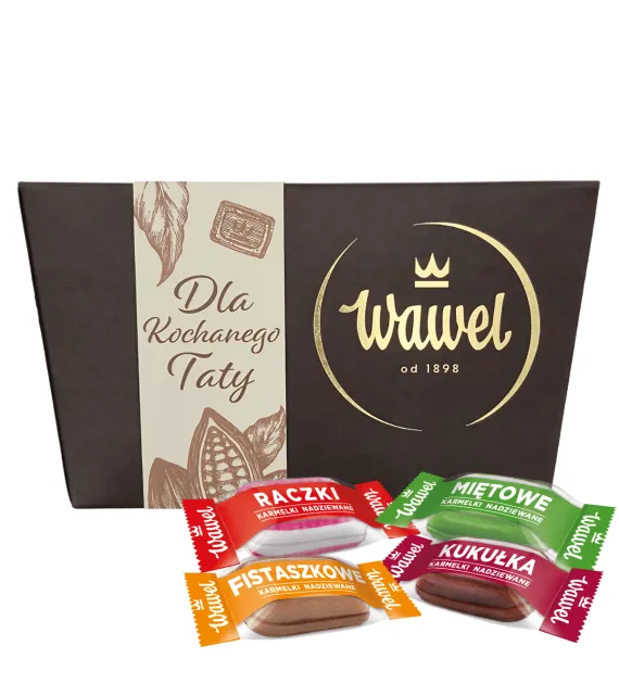Elegancki kuferek z limitowaną obwolutą „Dla kochanego Taty” to wyjątkowy upominek, który sprawi radość każdemu tacie. Wewnątrz znajduje się 400 g wybornych karmelków Wawel: Raczki, Fistaszkowe, Kukułka i Miętowe - nierozłączny kwartet, który zachwyca nie tylko smakiem, ale też wyjątkowym aromatem.