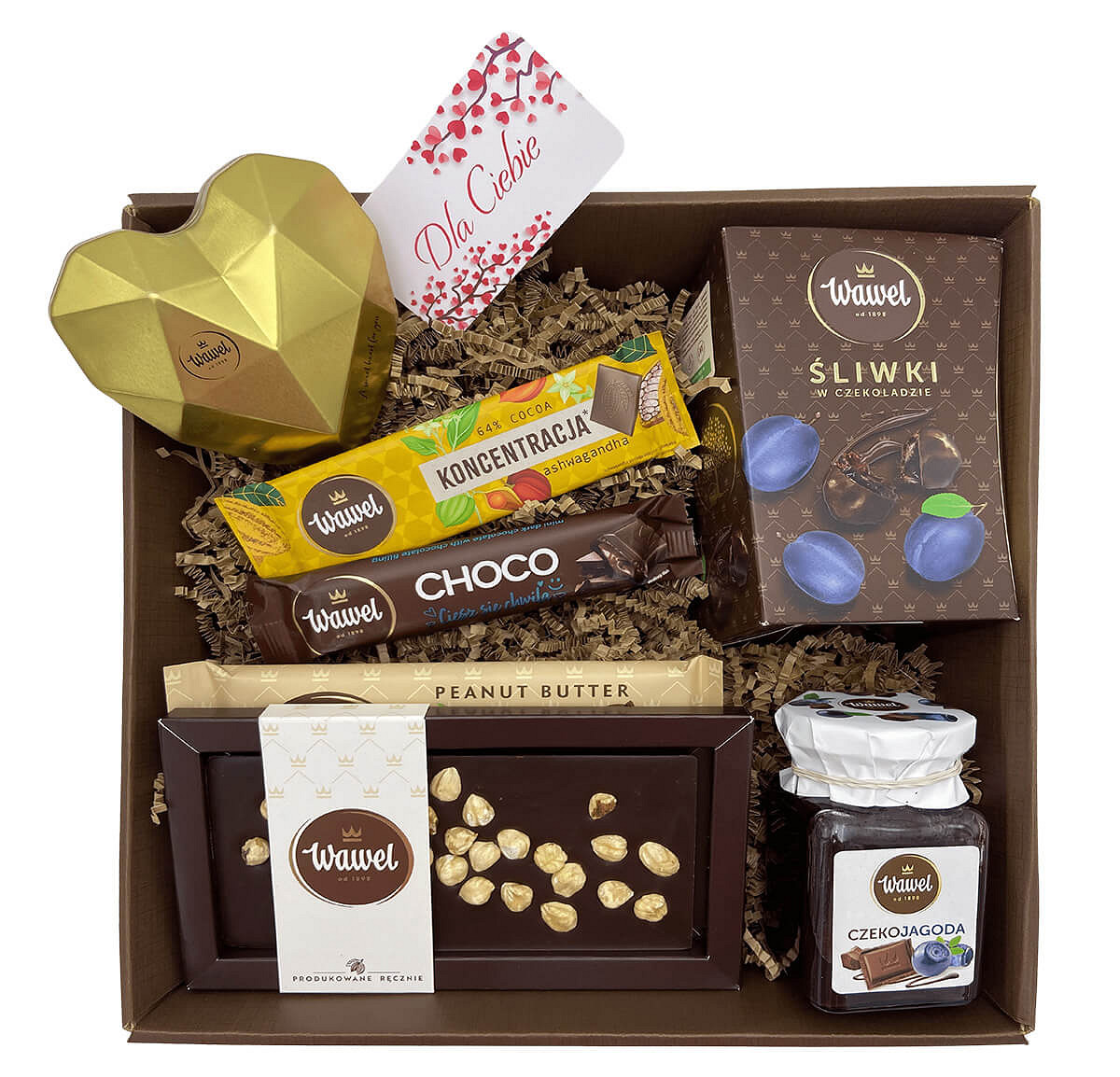 Walentynki to wyjątkowy czas, by wyrazić swoje uczucia w słodki i niezapomniany sposób. Nasz zestaw prezentowy stworzony specjalnie dla Niej to idealna kompozycja smaków, które rozpieszczą zmysły i wprowadzą wyjątkowy nastrój. Wyjątkowe czekoladki, bombonierka w kształcie serca, a także inne wyszukane słodkości i pyszności sprawią, że ten dzień będzie pełen miłości. Wszystko zapakowane w eleganckim stylu, by podkreślić szczególny charakter tej chwili.