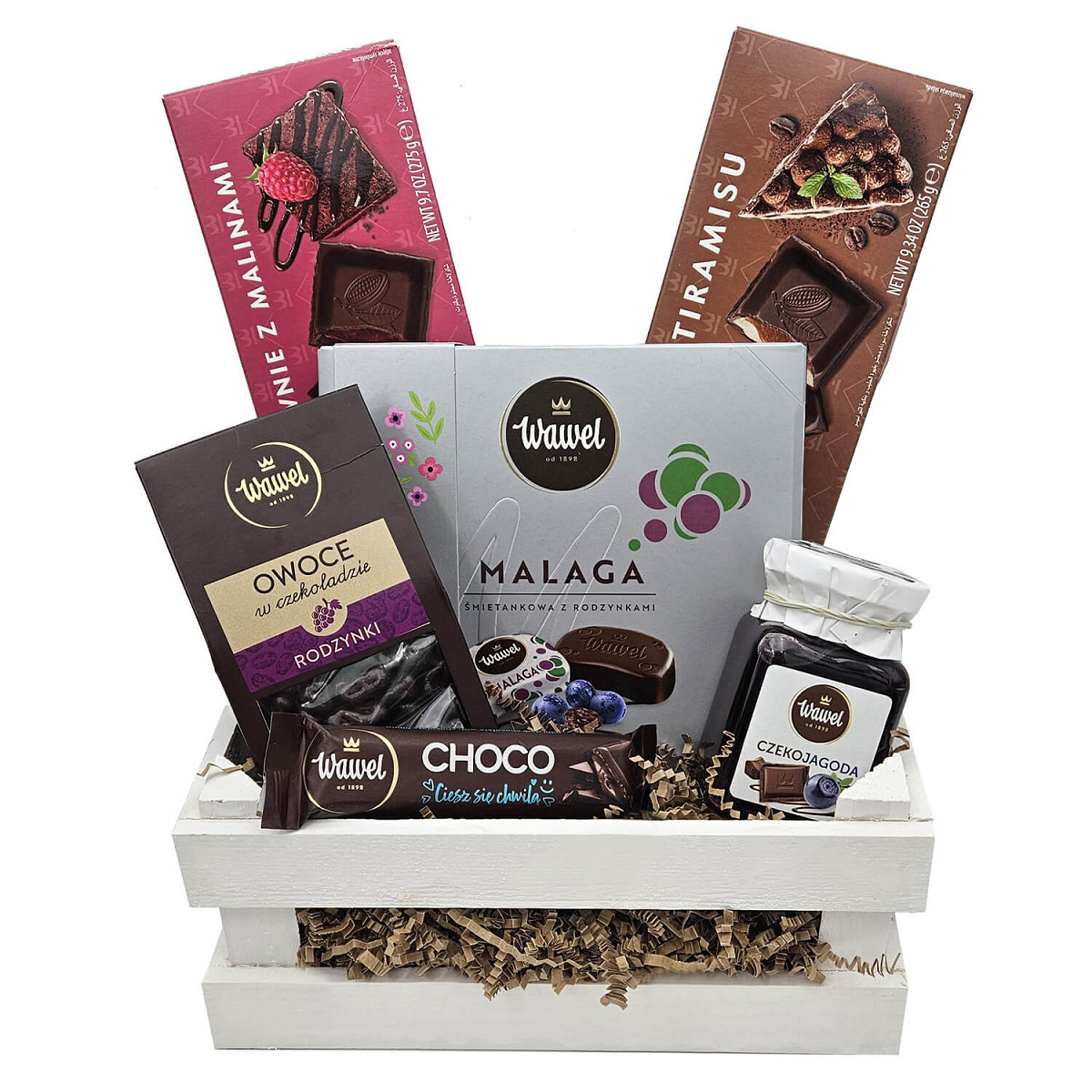 Jeśli szukasz prezentu od serca, którym obdarujesz bliską Ci osobę, to ten produkt sprawdzi się w tej roli idealnie. Praktyczna, biała skrzyneczka, wypełniona została aż po brzegi wybornymi słodyczami Wawel, w tym dwoma dużymi czekoladami - Tiramisu i Brownie z malinami, bombonierką Malaga 160 g czy MINIczekoladą Choco. Całość dopełniają limitowane produkty, dostępne wyłącznie w naszych sklepach firmowych - konfitura Czekojagoda 170 g i rodzynki w czekoladzie 150 g. Ta słodka skrzynia pakowana jest dodatkowo w elegancki celofan, przewiązany wstążką. Produkt gotowy, idealny na prezent.