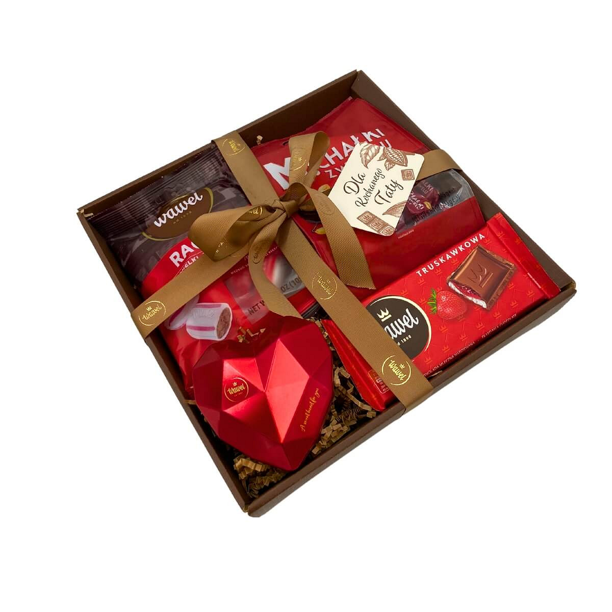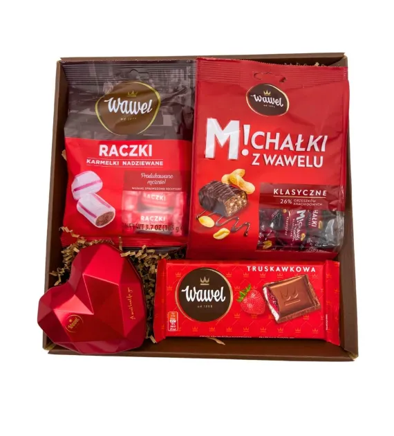 - Zestaw zawiera Karmelki Raczki, Michałki Klasyczne, Bombonierkę w kształcie serca Choco oraz Czekoladę Truskawkową. Wszystko zapakowane jest w eleganckie pudełko z wieczkiem, owinięte wstążką i przyozdobione bilecikiem dla taty!