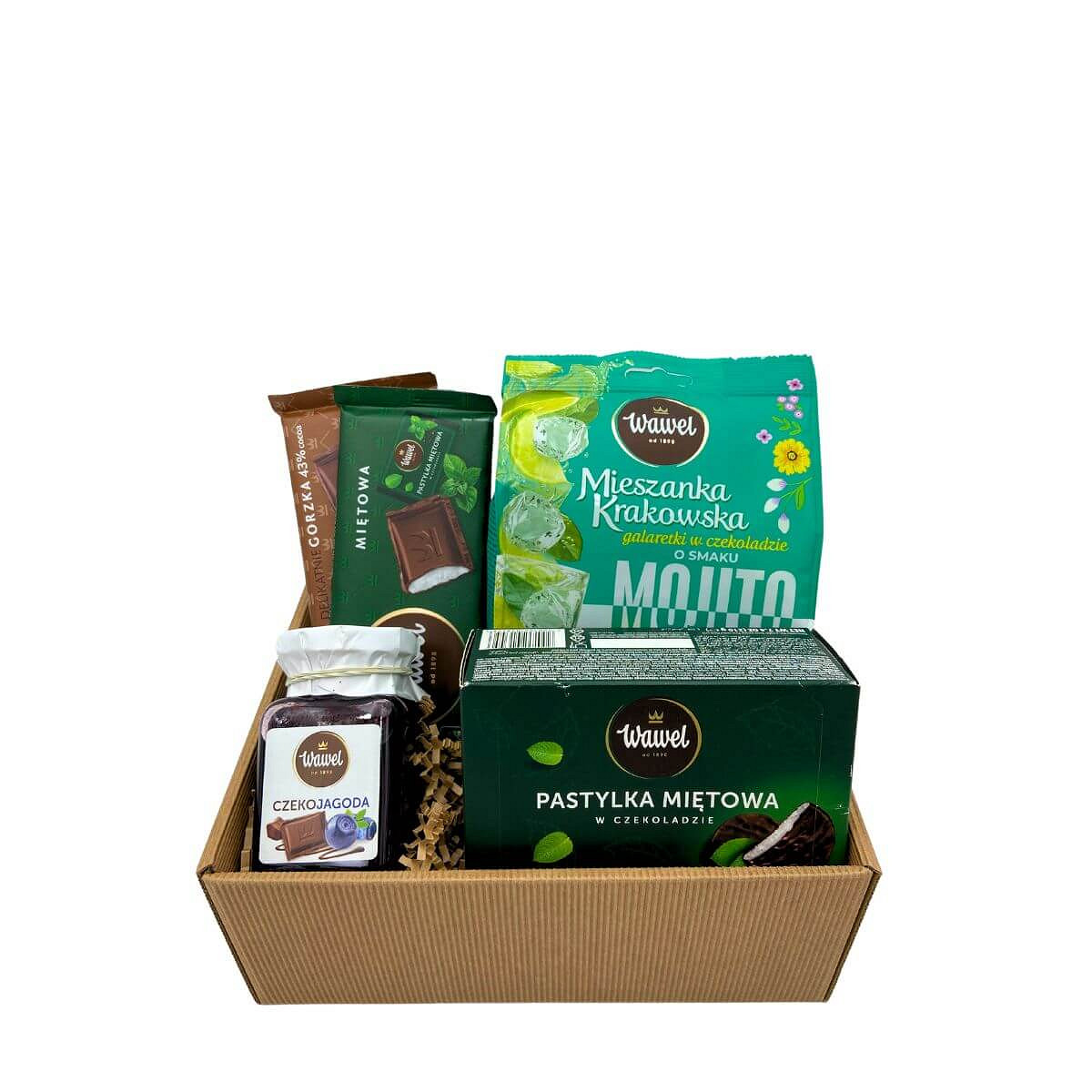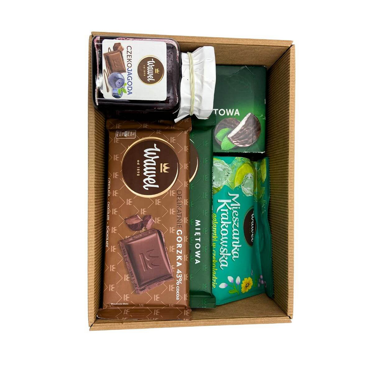 - Zestaw zawiera orzeźwiające smaki mięty (pastylki i czekolada miętowa), subtelną gorzką czekoladę, orzeźwiające galaretki w czekoladzie o smaku mojito oraz wyjątkową konfiturę o smaku czekolady i jagody.