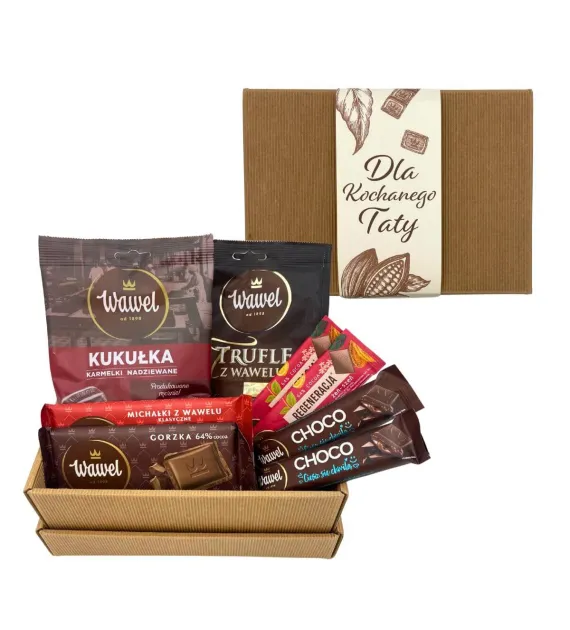 - Zestaw zawiera Nasze flagowe słodycze: Trufle z Wawelu, karmelki Kukułka, czekoladę Gorzką i nadziewaną oraz 4 MINIczekolady w dwóch smakach: Regeneracja i Choco, co sprawia, że jest to idealny wybór na Dzień Taty.